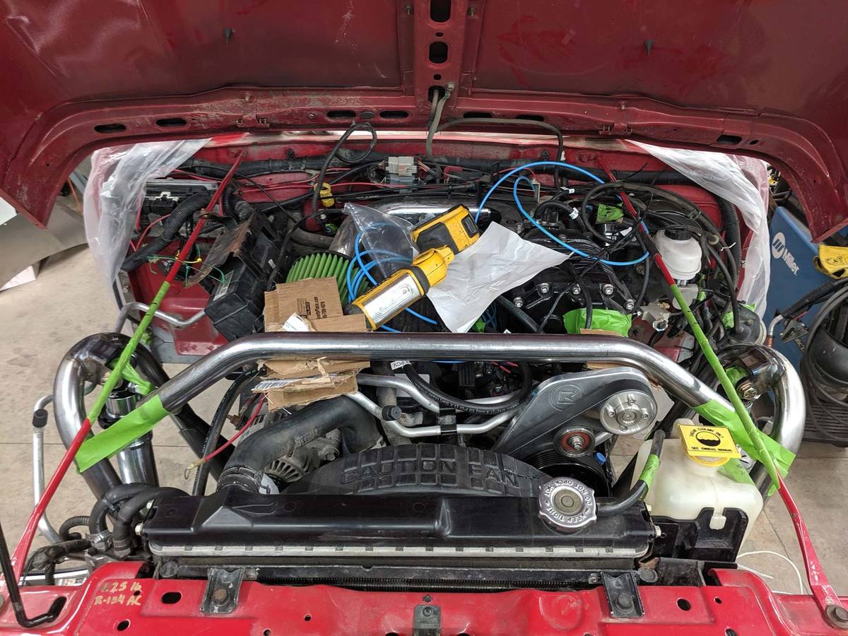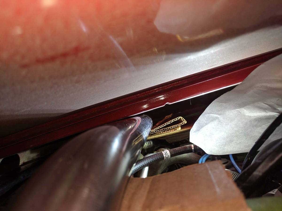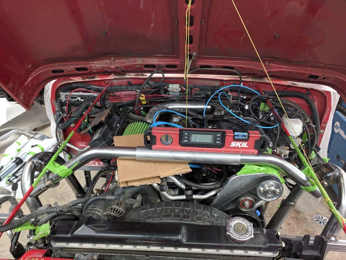 I roughly mocked up the hoop spreader bar stacked on sheets of cardboard and held in place with tape to clear the supercharger and I found that the hood wouldn't close by about 1/2" due to the reinforcement down the center of the hood. So much for being easy! I'll be cutting and sliding down the center section about 1" to make room.