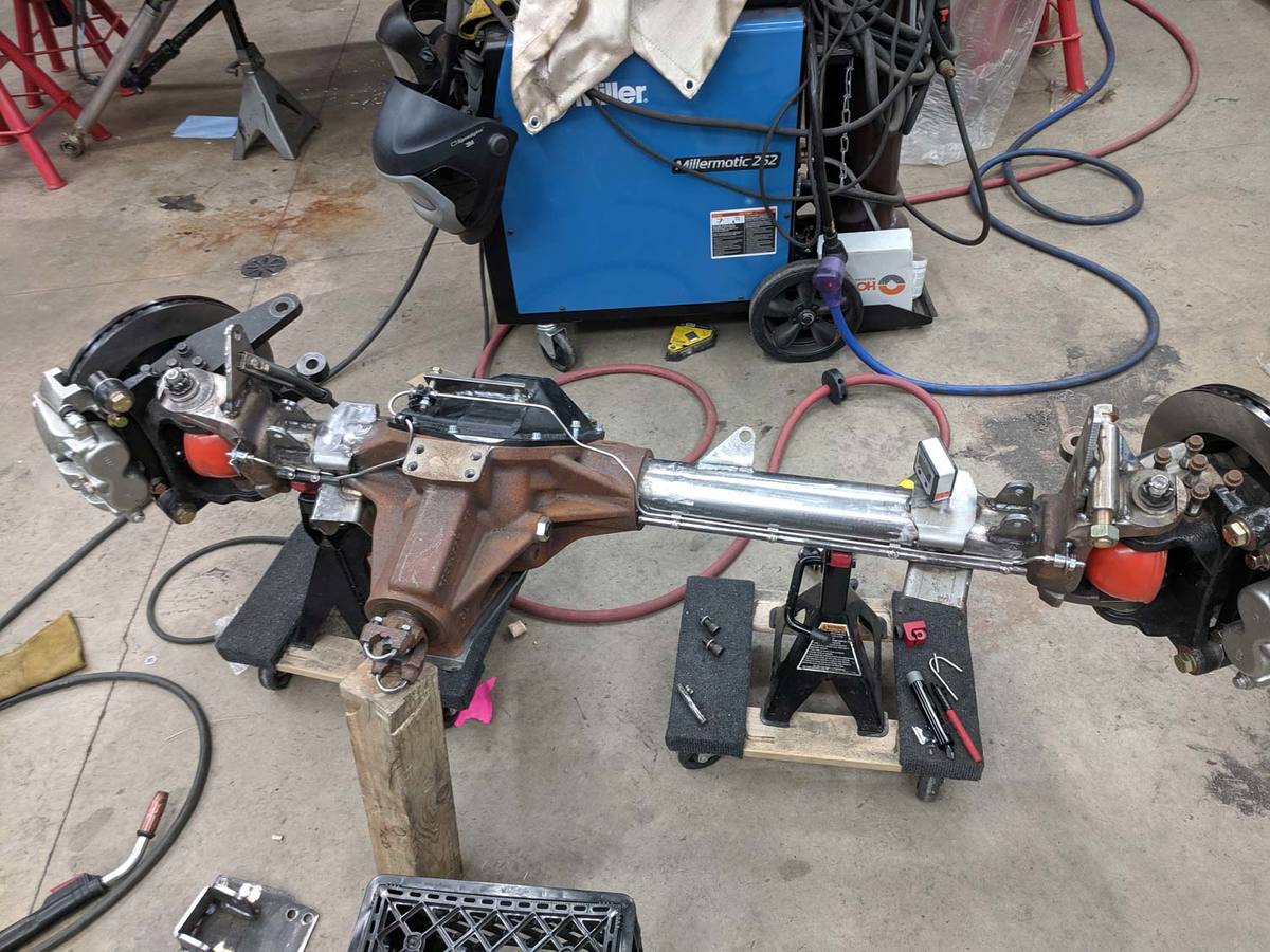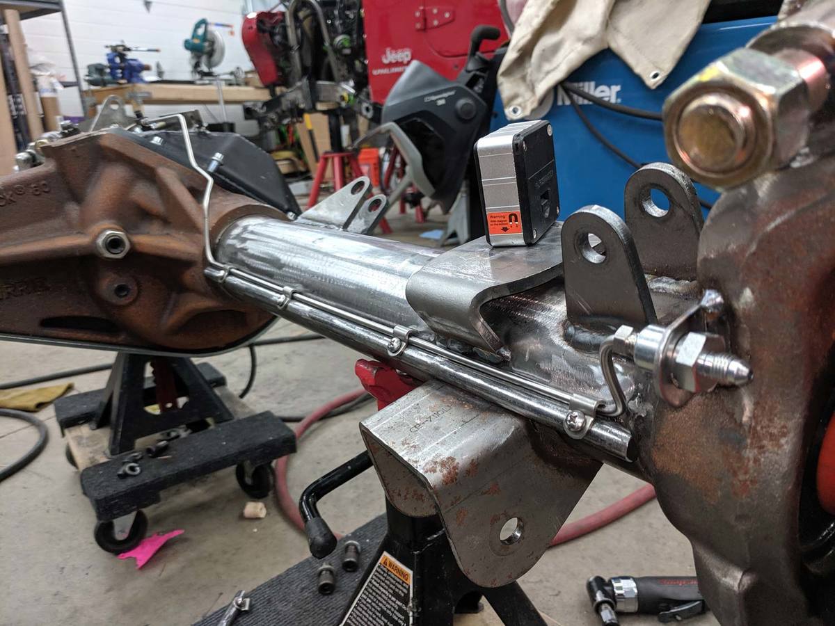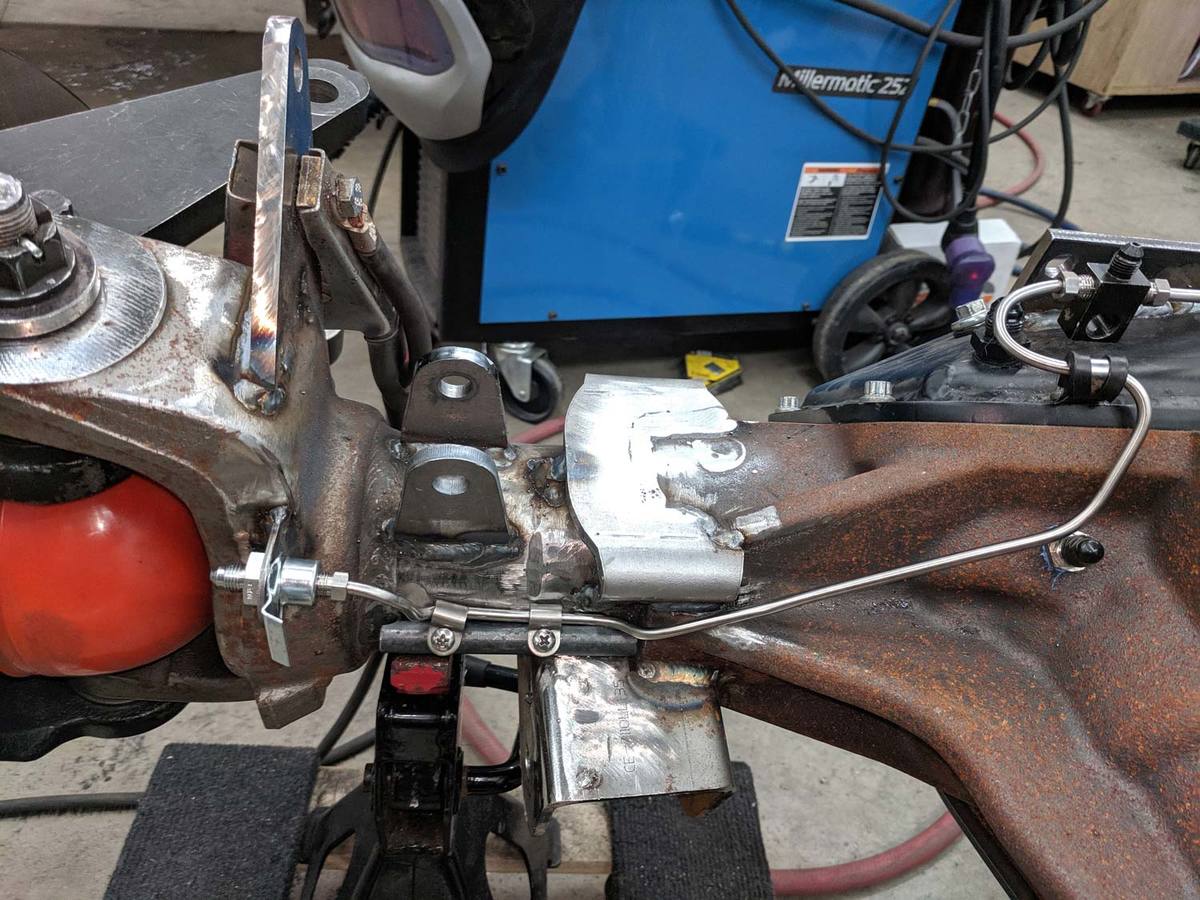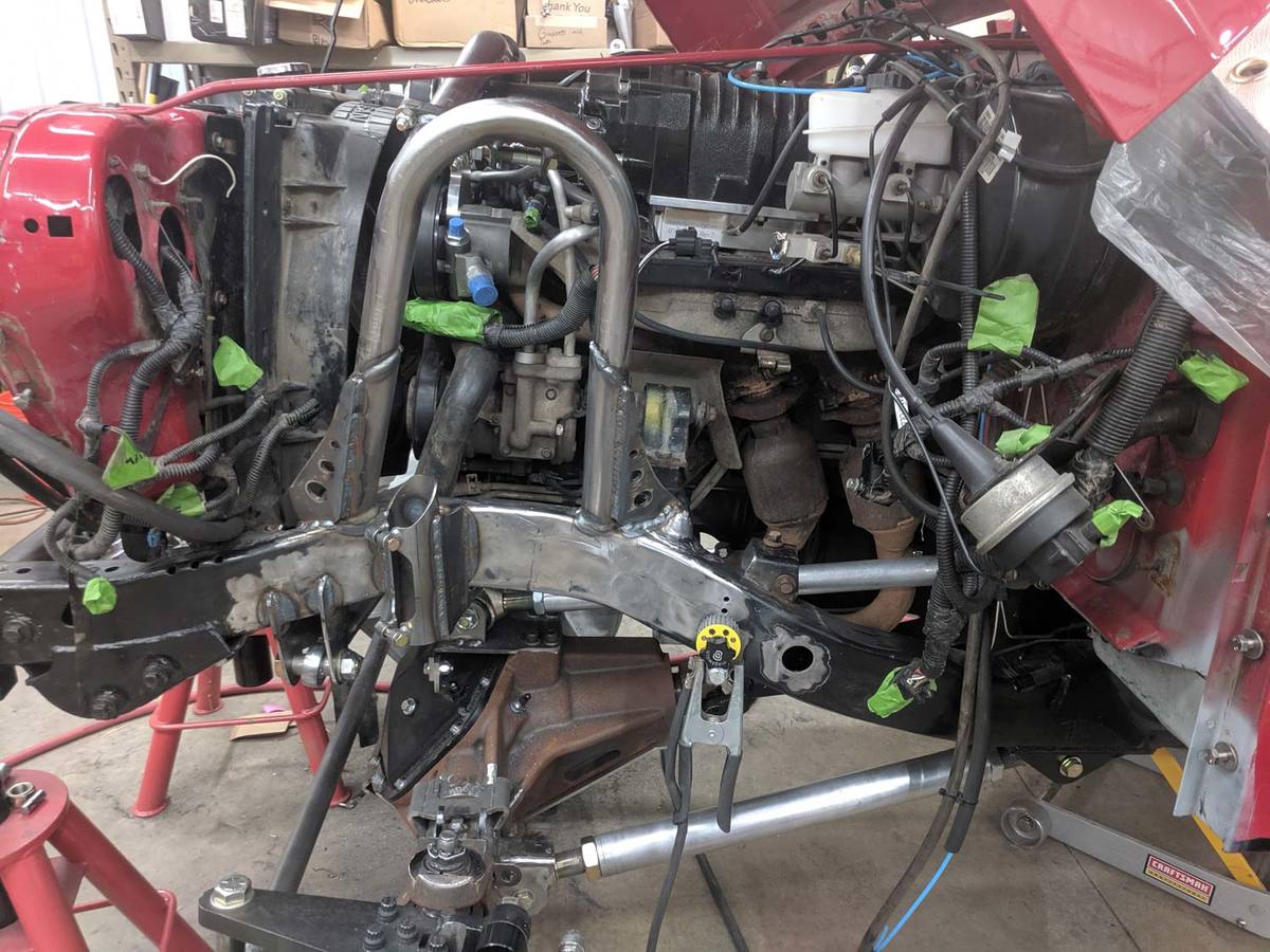 To prevent any warping during welding, I welded on a temporary spreader bar between the hoops across the front of the engine. I then fully welded the hoops to the frame.